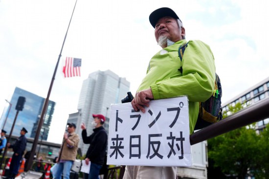 2025年10月28日,在日本東京的首相官邸外,示威者手舉標語抗議,表達對美國總統特朗普訪日的強烈不滿,反對日美強化軍事同盟破壞地區穩定。新華社記者賈浩成攝