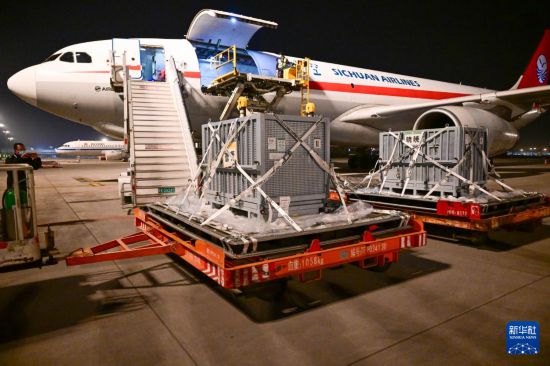 1月28日凌晨,大熊猫“晓晓”“蕾蕾”飞抵成都天府国际机场。新华社发(中国大熊猫保护研究中心供图)